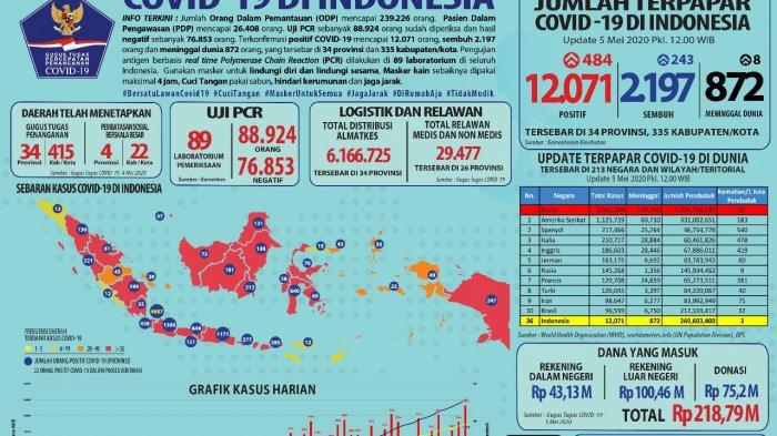 TRIBUNBANTEN.COM - Pemerintah melalui Gugus Tugas Percepatan Penanganan Covid-19 melaporkan jumlah kasus Coronovirus Diseas (Covid-19) per Selasa, 5 Mei 2020, pukul 12.00 WIB, sebanyak 12.071 orang atau bertambah 484 orang dalam sehari terakhir.