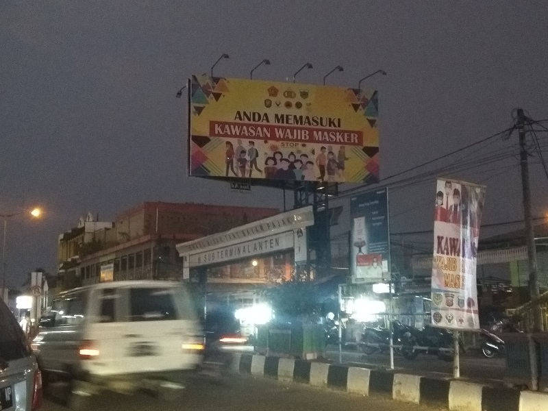 Spanduk besar berwarna kuning itu, dihiasi 10 lampu sorot bertuliskan "Kawasan Wajib Masker" yang diblok berwarna merah terpasang tepat di atas gapura Sub Terminal Anten Pandeglang, KM 10, Panimbang, Pandeglang.