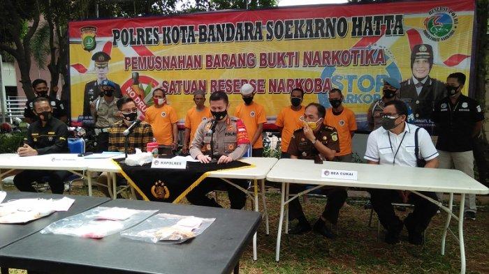 TRIBUNBANTEN.COM, KOTA TANGERANG - Satuan Reserse Narkoba (Satresnarkoba) Polres Kota Bandara Soekarno Hatta memusnahkan barang bukti narkotika, di kantor Polres Kota Bandara Soekarno Hatta, Tangerang, pada Selasa (22/9/2020).