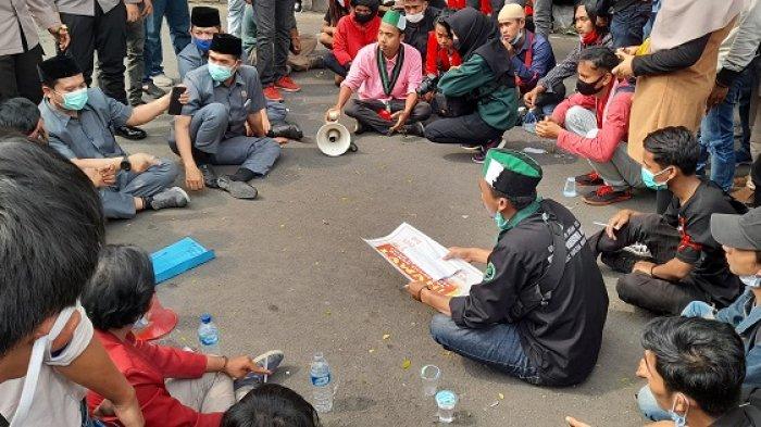 TRIBUNBANTEN.COM, PANDEGLANG - Ratusan mahasiswa yang tergabung dalam Aliansi OKP Cipayung Plus Kabupaten Pandeglang kembali menggelar unjuk rasa penolakan Omnibus Law UU Cipta Kerja di depan Gedung DPRD Kabupaten Pandeglang, Jalan Pendidikan, Pandeglang, Banten, Kamis (15/10/2020).