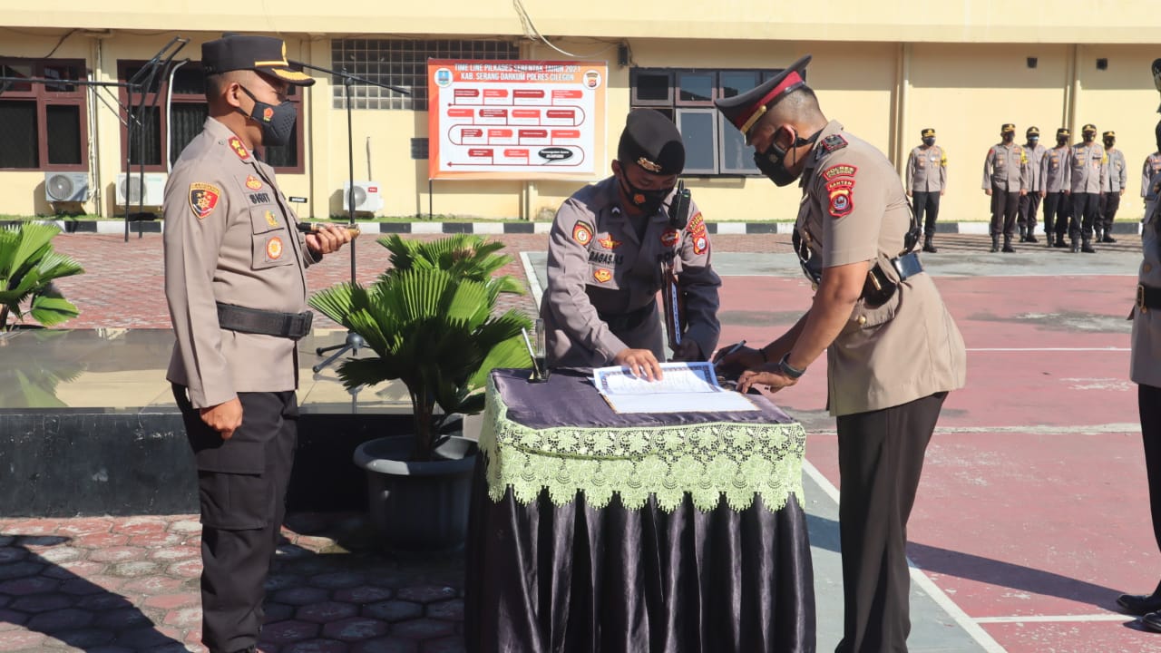 Acara Serah terima kasat Sabhara Polres Cilegon menjalankan Protokol Kesehatan.