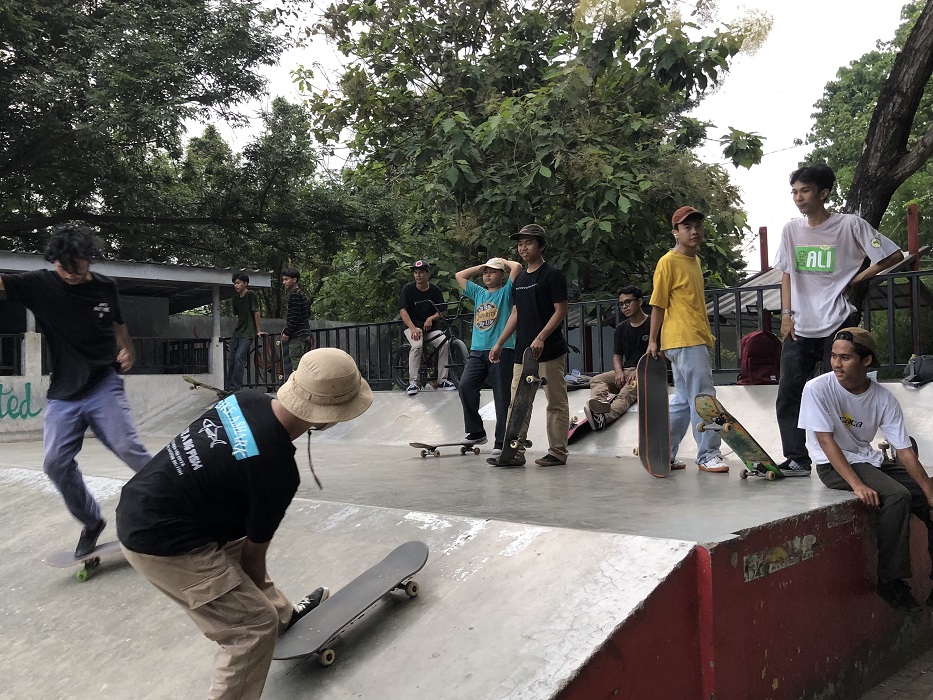 Komunitas United One Skateboard bermain papan luncur di Skatepark Loop Arena, Stadion Maulana Yusuf, Kota Serang, Jumat (2/4/2021).