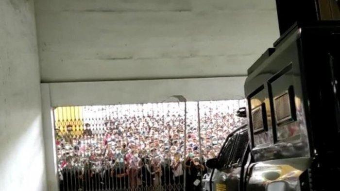 Berdasarkan video itu, ribuan warga mengantre memaksa masuk ke gedung. Mereka menjebol pintu besi yang membatasi antara gedung dan warga.