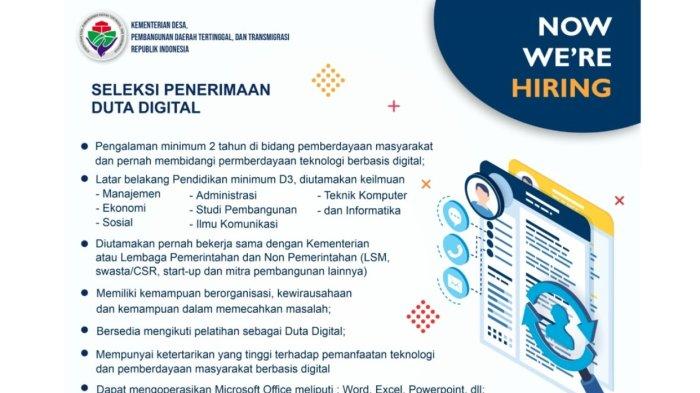 Dilansir Tribunjabar.id dari laman resminya, lowongan kerja kali ini ditujukan untuk menjadi Duta Digital Desa Cerdas yang diselenggarakan Kemendes.
