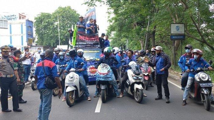 TRIBUNBANTEN.COM, TANGERANG - Ribuan buruh di Tangerang bergerak menuju Jakarta, dan akan bergabung dengan ribuan buruh lainnya di Jabodebek, untuk melakukan unjuk rasa, ke Istana Negara, Jakarta Pusat, Rabu (8/12/2021).