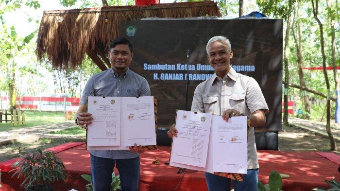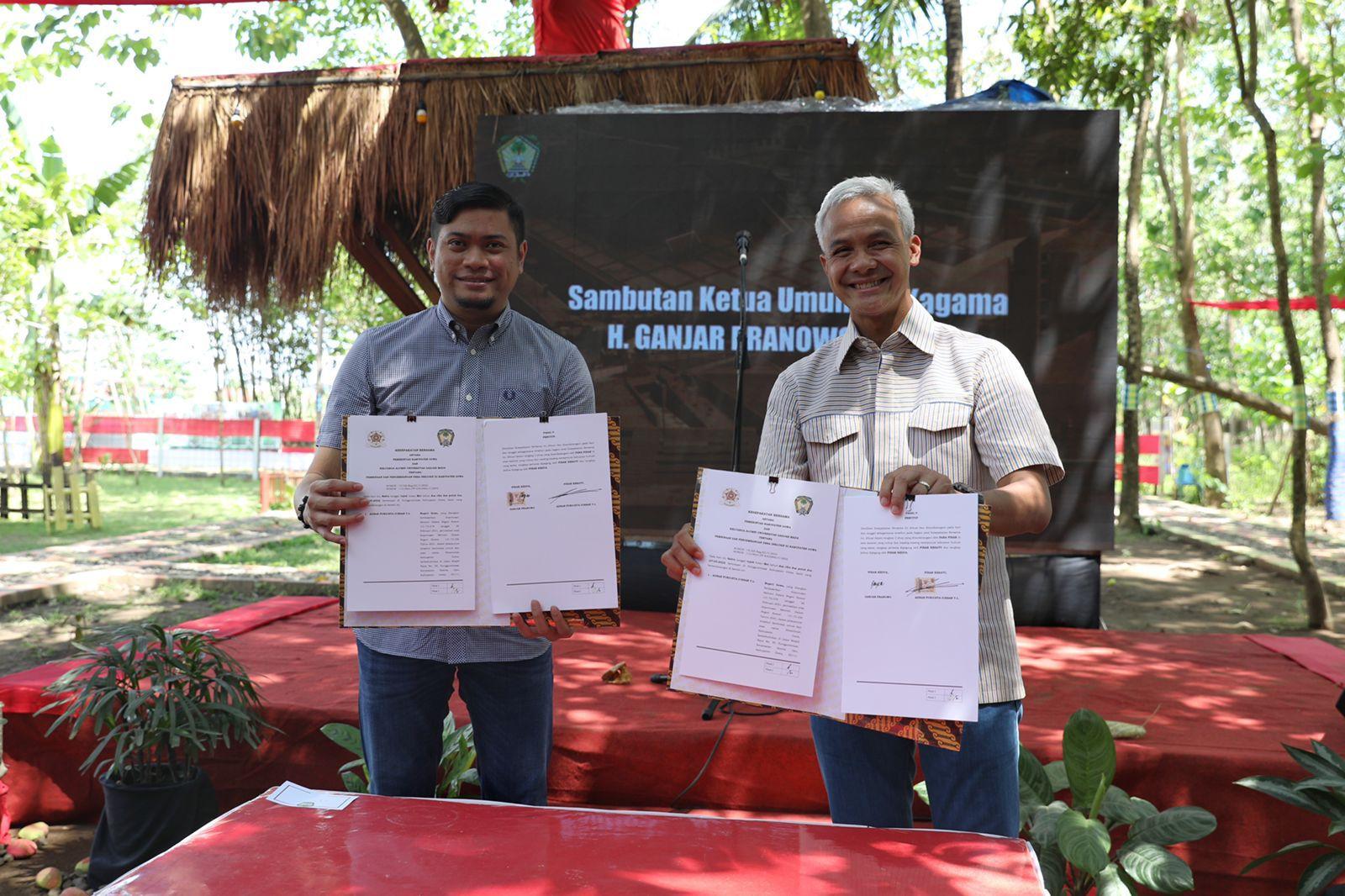 TRIBUNBANTEN.COM - Ketua Keluarga Alumni Gadjah Mada (Kagama) Ganjar Pranowo menandatangani MoU dengan Bupati Gowa, Adnan Purichta Ichsan, Sabtu (7/5/2022).