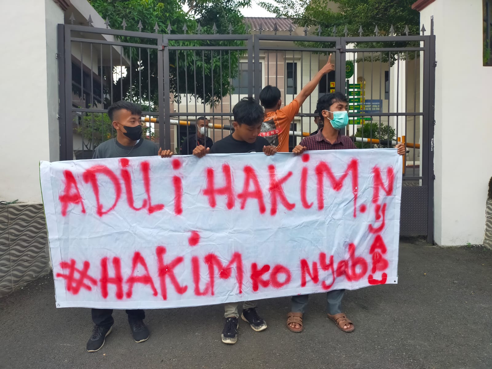 Mahasiswa yang berada di depan gerbang pengadilan menyampaikan orasi, dan tuntutannya agar kedua orang hakim tersebut di pecat dan segera diadili.