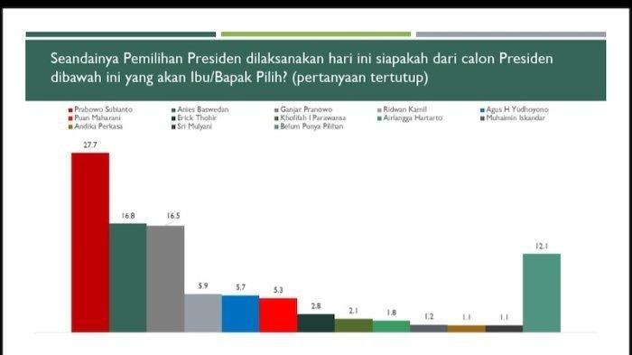 Sementara untuk posisi teratas ada nama Ketua Umum Gerindra Prabowo Subianto menempati tingkat elektabilitas mencapai 27,7 persen.