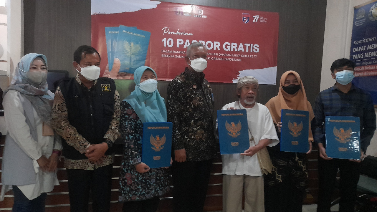 Kantor Wilayah Kementrian Hukum dan HAM atau Kemenkumham Banten menyerahkan paspor gratis kepada masyarakat, Kamis (18/8/2022).