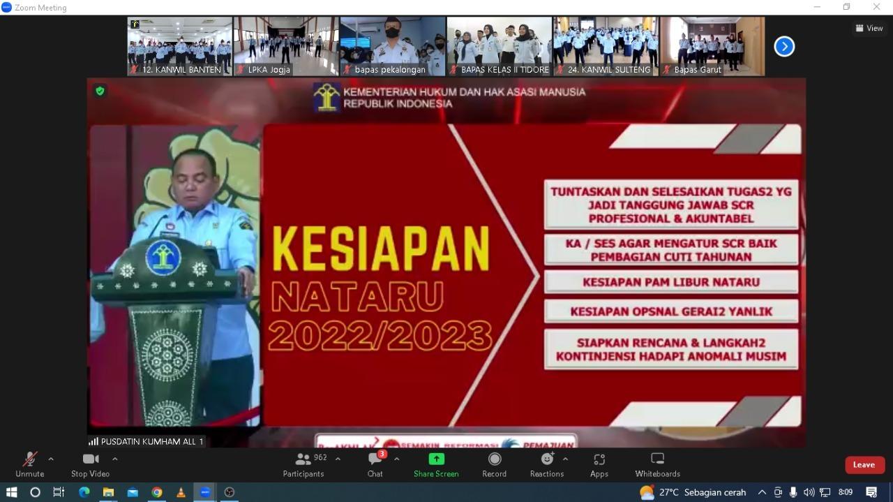 TRIBUNBANTEN.COM, SERANG - Kepala Kanwil Kemenkumham Banten, Tejo Harwanto, mengikuti upacara peringatan Hari Bela Negara dan Kesiapan Nataru secara virtual, Senin (19/12/2022).