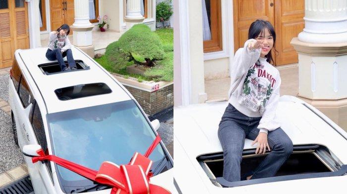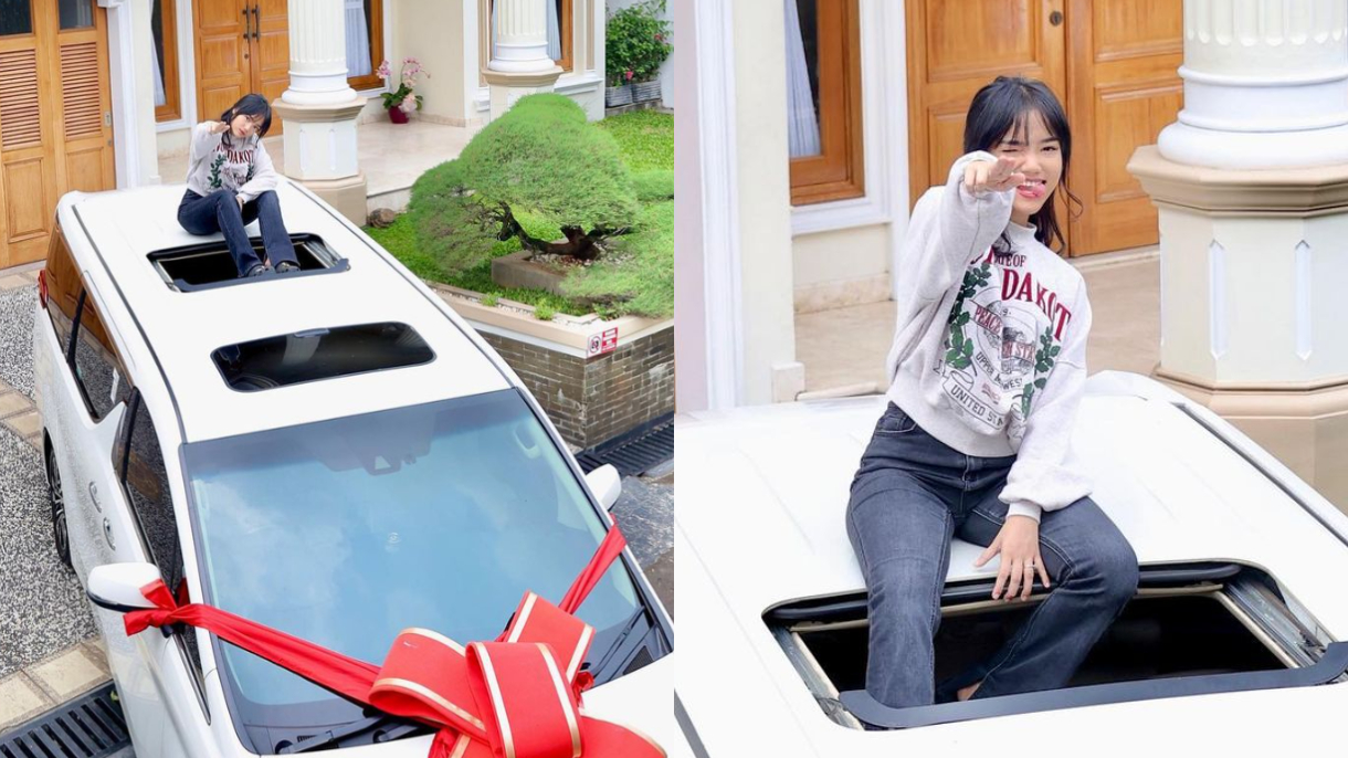 Tampak Fuji duduk di atas mobil Alphard putih dibalut pita merah yang terparkir di rumah barunya.