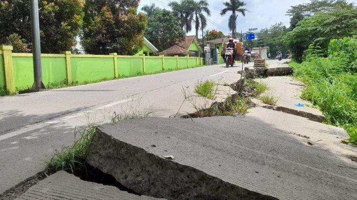 Ruas Jalan Raya Pamarayan-Petir, Kecamatan Cikeusal, Kabupaten Serang, nampak retak-retak, terbelah dan amblas.