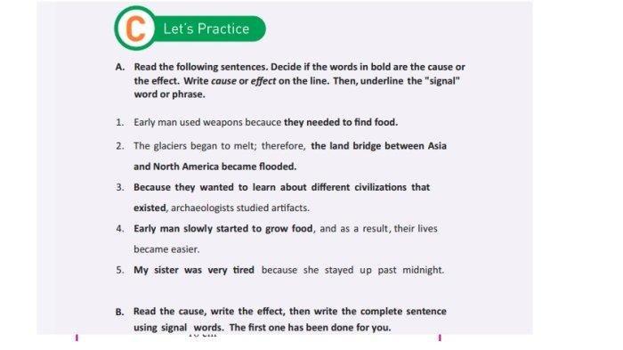 A. Read the following sentences. Decide if the words in bold are the cause or the effect. Write cause or effect on the line. Then, underline the "signal" word or phrase.