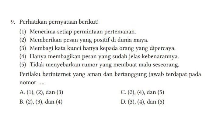 Siswa akan diminta menjawab soal "Perilaku berinternet yang aman dan bertanggung jawab terdapat pada nomor ...."