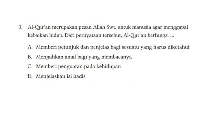 Siswa akan diminta menjawab soal "Al-Qur’an merupakan pesan Allah Swt. untuk manusia agar menggapai kebaikan hidup. Dari pernyataan tersebut, Al-Qur’an berfungsi …"