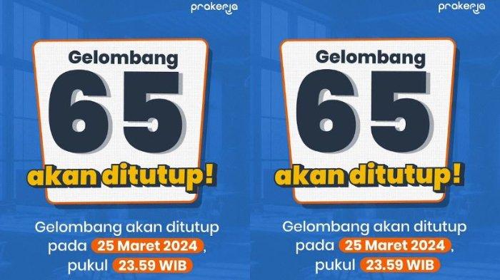 Kartu Prakerja Gelombang 65 akan ditutup malam ini, Senin 25 Maret 2024 pukul 23.59 WIB.