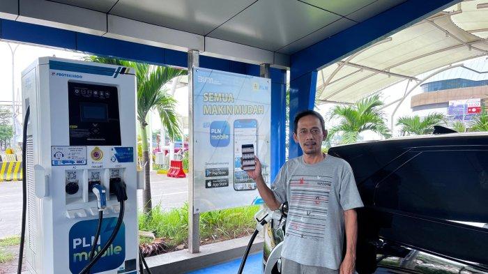 TRIBUNBANTEN.COM - Rudi, pemudik pengguna mobil listrik asal Serang menuju Sumatera, mengaku puas dengan layanan stasiun pengisian kendaraan listrik umum (SPKLU) Pelabuhan Merak.