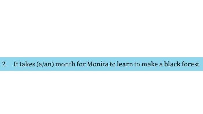 Kunci Jawaban Bahasa Inggris Kelas 7, It Takes A/An Month for Monita to Learn to Make A Black Forest