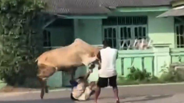 Dua warga yang berada di garis depan, yang semula tampak menguasai keadaan, terpental jauh akibat kekuatan amukan sapi yang tak terduga.