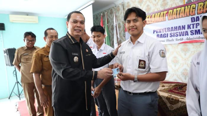 Wali Kota Serang Budi Rustandi memberikan Kartu Tanda Penduduk Elektronik (KTP-el) kepada 31 siswa SMA Negeri 1 Serang pada Selasa (14/10/2025).