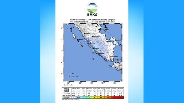 Gempa hari ini kembali mengguncang wilayah Bengkulu, Rabu (8/10/2025) sore dengan kekuatan guncangan Magnitudo 4,7.
