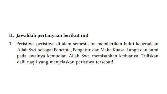 1. Peristiwa-peristiwa di alam semesta ini memberikan bukti keberadaan Allah Swt. sebagai Pencipta, Pengatur, dan Maha Kuasa. Langit dan bumi pada awalnya kemudian Allah Swt. memisahkan keduanya. Tuliskan dalil naqli yang menjelaskan peristiwa tersebut!
