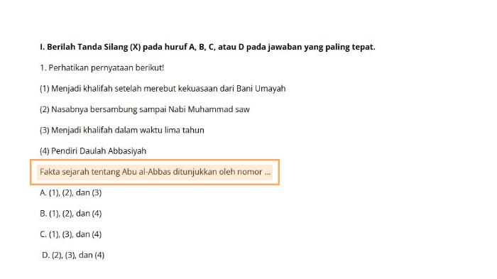 Pada soal Rajin Berlatih Pilihan Ganda nomor 1, peserta didik akan menjawab soal tentang fakta sejarah tentang Abu al-Abbas.
