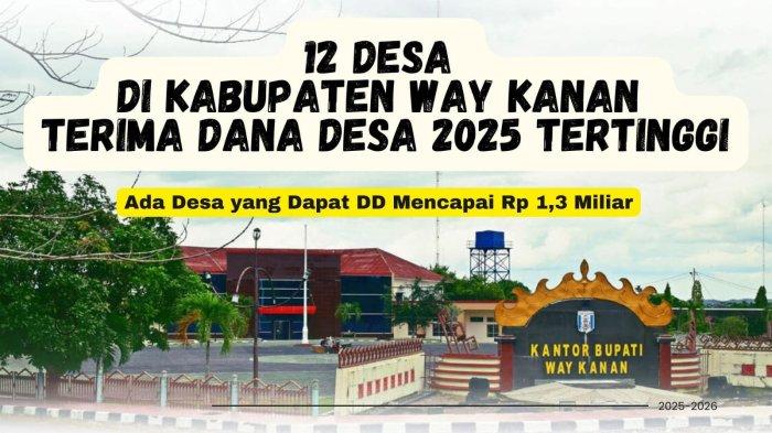 Berikut ini daftar 12 desa di Kabupaten Way Kanan Provinsi Lampung yang menerima alokasi dana desa tertinggi dari Pemerintah Pusat Tahun Anggaran 2025