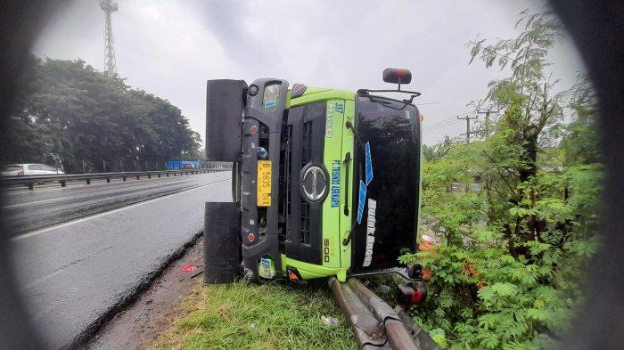 Truk terguling di Tol Tangerang-Merak Km 76, Kota Serang, Minggu (3/7/2022) pagi.
